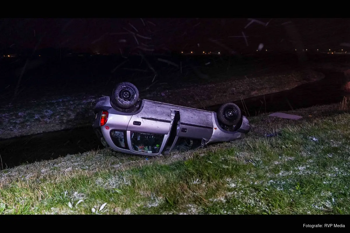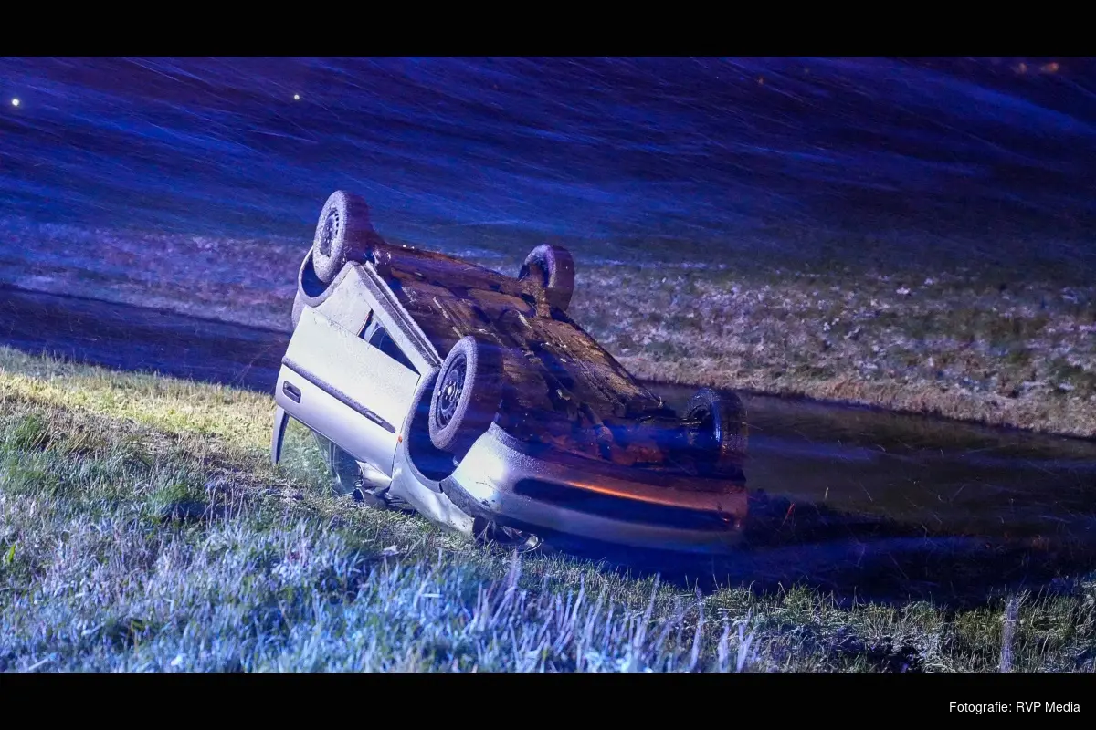 Een automobilist verloor, mogelijk door de ontstane gladheid, de macht over het stuur en vloog vervolgens over de kop en kwam op het dak van de auto tot stilstand in de naastgelegen berm. Vanwege het ongeval werden diverse hulpdiensten opgeroepen waaronder de brandweer en de politie samen met de ambulancedienst.