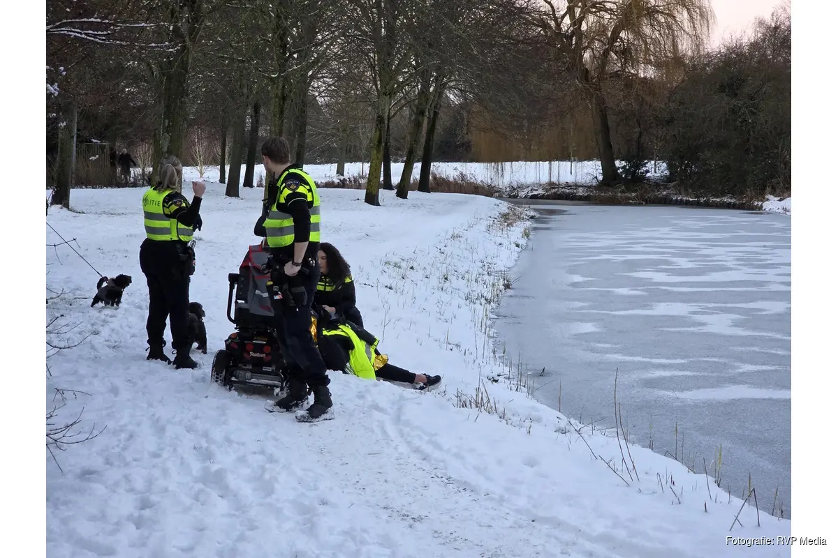 Buurtbewoners zagen een man op een scootmobiel langs het water rijden waarna hij de macht over het stuur verloor en op het ijs viel met zijn twee hondjes. De man werd direct door omwonenden geholpen en zijn scootmobiel werd rechtop gezet.