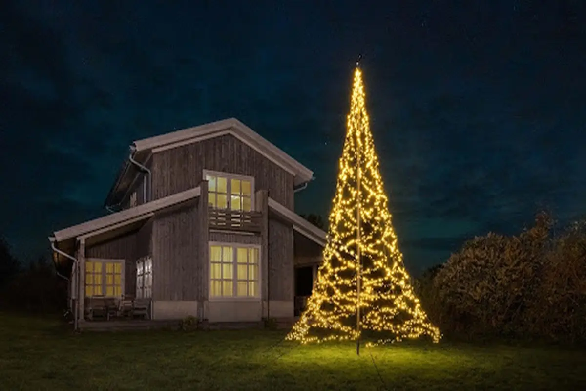 Wie een vlaggenmast in de tuin heeft, kan met weinig moeite een opvallend lichtpunt creëren. Door een lichtnet vanuit de top naar beneden te spannen, ontstaat een perfecte kerstboom vorm die van veraf te zien is.